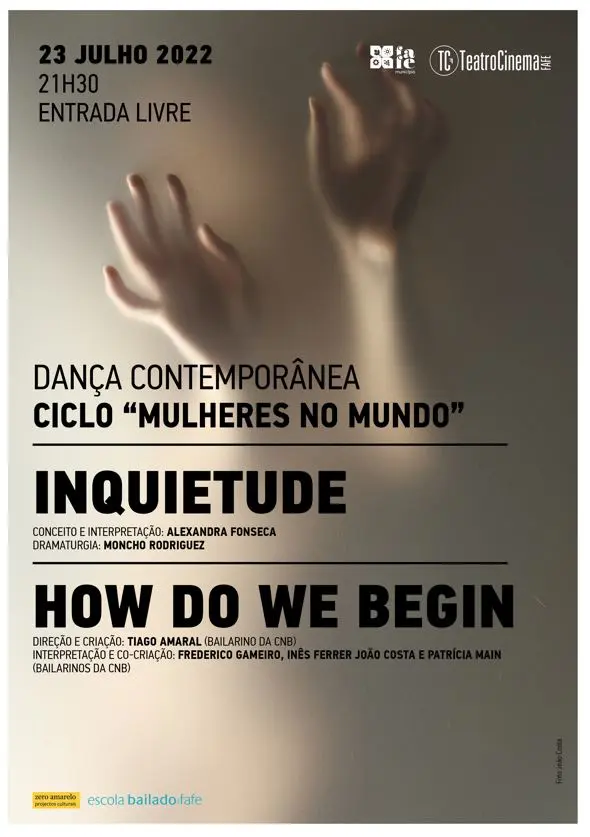 A Escola de Bailado de Fafe apresenta, em parceria com a Zero Amarelo Projetos Culturais, um espetáculo de dança contemporânea no próximo dia 23 de julho, sábado, às 21h30, no Teatro Cinema de Fafe. A apresentação, de entrada livre, é composta por duas peças - "Inquietude" e "How do we begin" - que integram o ciclo "Mulheres do Mundo". Pensar a mulher e o seu lugar no mundo tem sido o mote para viajar pelo universo feminino, pela história, pela vida de mulheres reais ou imaginárias. Este espetáculo apresenta, por sua vez, um olhar masculino sobre esta temática.